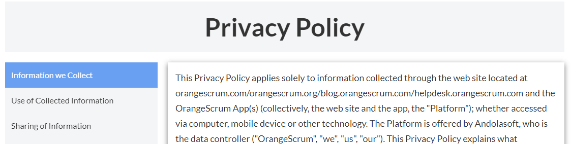 This Privacy Policy applies solely to information collected through the web site located at orangescrum.com/orangescrum.org/orangescrum.com/blog/helpdesk.orangescrum.com and the OrangeScrum App(s) (collectively, the web site and the app, the "Platform"); whether accessed via computer, mobile device or other technology. The Platform is offered by Andolasoft, who is the data controller ("OrangeScrum", "we", "us", "our"). This Privacy Policy explains what information may be collected through the Platform, how such information may be used and/or shared with others, how we safeguard it and how you may access and control its use in connection with our marketing communications and business activities.